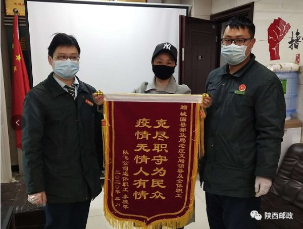 “疫情期间,是邮政员工恪尽职守,上门为我父亲办理业务,我们真心感谢!”城固县分公司老庄营业所理财经理刘斌、营业员袁野,为行动不便的崔家山养老金客户提供上门服务,用实际行动践行“人民邮政为人民”的服务宗旨,赢得了客户的认可。3 月 10 日上午,该客户的女儿骑电动车 13公里,从崔家山来到老庄营业所,送上一面锦旗。(叶江涛)