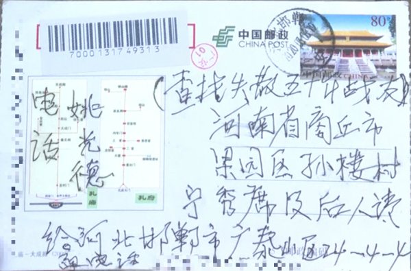 乔金涛是商丘市邮政分公司的一名投递员,2019年他顺利地加入了中国共产党。3月8日,乔金涛接到一份从河北省邯郸市寄往“商丘市梁园区孙楼村”的明信片。这封信令他既着急又为难。着急的是明信片上写着“查找失散五十年战友”,为难的是收件地址写得不详细,在梁园区范围内的孙楼村就有4个,而每个孙楼村的常住人口有2000人,怎么才能知道姚光德老人找的是哪个孙楼村呢?这样的“死信”找寻,可谓大海捞针,费时费力,但是乔金涛转念一想,退役军人是党和国家的宝贵财富,是出生入死为国家做过贡献的人,邮政有责任和义务找到这封满载着几十年思念之情战友信的主人。