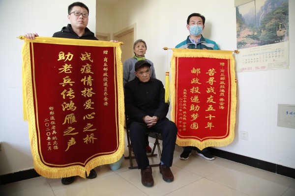精诚所至,金石为开。不久,宁吉庆传来好消息,在家谱中找到了宁秀席老人的名字!但乔金涛心细如发,为了确保万无一失,他一边与河北邯郸的姚光德进一步了解关于宁秀席老人的细节,一边与宁秀席的儿子、老伴询问其相关信息,由于当时正值疫情防控最吃劲的阶段,各个社区村庄卡点值守严格,乔金涛无法亲自到宁秀席家中核实,只能经过一通又一通电话反复核对:1959年入伍、1971年转业回到商丘……原来,自从1970年两位老人分别后,姚光德就一直用宁秀席当初在郊区公社孙楼村的地址给他寄信,但由于行政区划的变更,50年前的老地址早已不复存在,因此期间姚光德老人寄出的信都被退了回去。一次偶然的机会,姚光德看到一场来自商丘的戏曲流动演出,心中又想起老战友,便到后台询问孙楼村现在属于哪个区域,才知道了孙楼村早已划归梁园区,于是他又提笔写下了这封寻找宁秀席的信。谁知这封地址仍然不详的信,幸亏遇到了耐心细致的乔金涛,开启了一波三折的“死信复活之路”,终于让这对失联了半个世纪的老战友再次取得了联系。正如两位老人送给乔金涛的感谢锦旗上所写:“苦寻战友五十年 邮政投递助圆梦”。