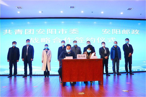 共青团安阳市委副书记马欢、安阳市邮政分公司副总经理刘栓林代表双方签订战略协议。共青团安阳市委书记元浩、安阳市邮政分公司总经理程豪岭见签。