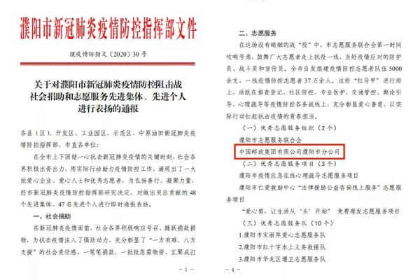 近日,濮阳市新冠肺炎疫情防控指挥部对该市疫情防控阻击战社会捐助和志愿服务先进集体、先进个人进行了通报表扬,其中濮阳市邮政分公司被授予“优秀志愿服务组织”称号。