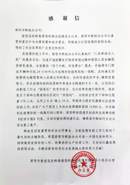 近日,郑州市邮政分公司收到了郑州新密市新冠肺炎疫情防控领导小组办公室寄来的感谢信。在信中,新密市疫情防控办公室对该市邮政分公司在疫情期间积极助力打好疫情防控阻击战、统筹抓好生产经营工作、确保企业安全复工复产表示充分肯定,称赞邮政以实际行动彰显了行业“国家队”的责任和担当。