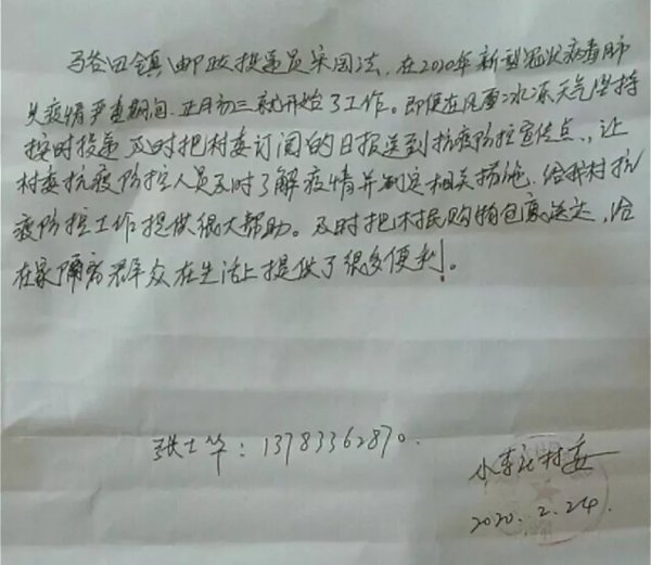 “新冠肺炎疫情期间,投递员宋国法正月初三就开始工作。在风雪冰冻天气他也坚持投递,及时把村委订阅的日报送到抗疫防控宣传点,让村委抗疫防控人员及时了解疫情并制定相关措施,给我村抗疫防控工作提供很大帮助。”近日,泌阳县小李庄村文书张士华代表村委会来信,对疫情期间坚守岗位的驻马店泌阳县马古田邮政支局投递员宋国法表示感谢。
