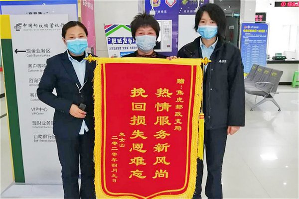 三天后,朱女士来到焦虎支局,送来了一面写着“热情服务新风尚 挽回损失恩难忘”的锦旗,对邮政人认真负责的工作态度表示了高度赞扬。她拉着顾华争的手说:“真是多亏了咱邮政工作人员,保住了俺的血汗钱,真不知道该怎么感谢你们。还是邮政最可靠啊!”