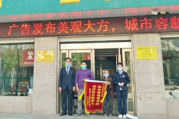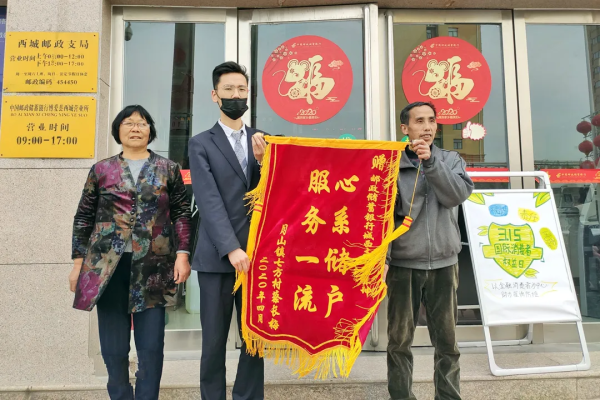 4月21日,家住焦作市博爱县月山镇七方村的蔡大妈和她的爱人来到西城邮政支局,将一面印有“心系储户 服务一流”金色大字的锦旗送到了支局长王东琨的手里,由衷感谢邮政员工的用心服务、爱岗敬业精神。