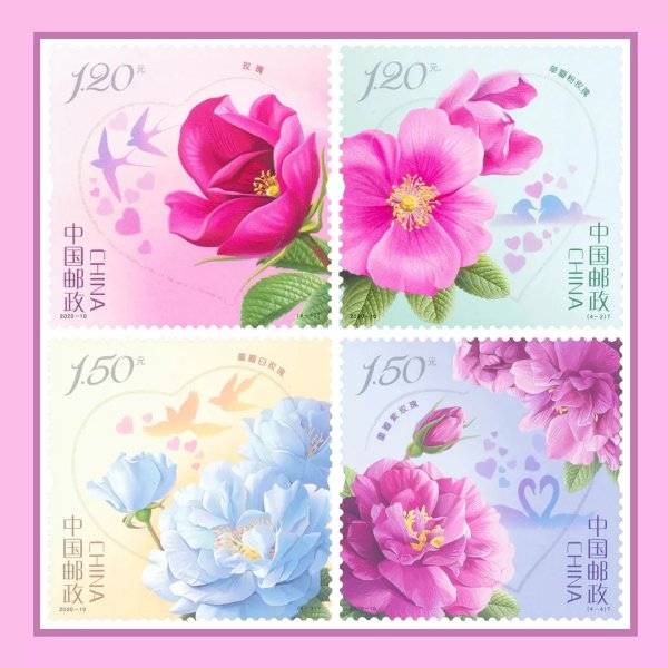 《玫瑰》特种邮票一套4枚,由河南省邮电印刷厂胶版工艺印制。邮票图案名称分别为:玫瑰、单瓣粉玫瑰、重瓣白玫瑰 、重瓣紫玫瑰,全套邮票面值为5.40元。
