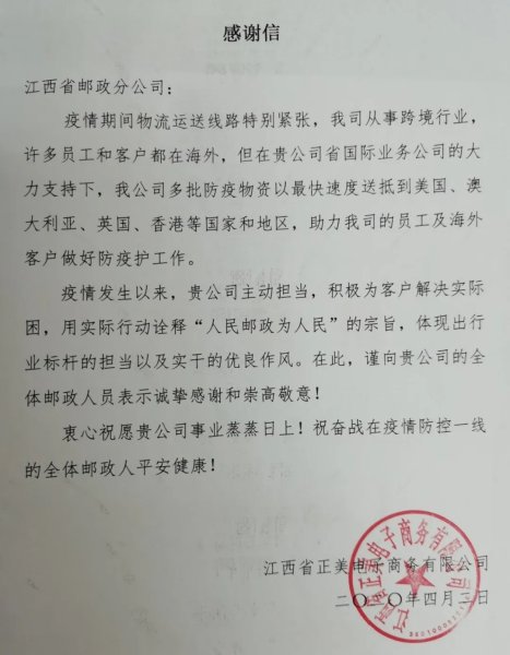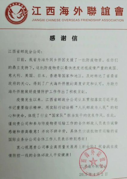 近日,省分公司相继收到江西海外联谊会、江西省正美电子商务有限公司发来的感谢信。他们在信中充分肯定我省邮政在特殊时期,排除万难,以最快速度将防疫物资送抵疫情严重的美国、意大利、英国、日本、香港等国家和地区,及时转达了省委省政府的关心,得到了广大海外侨胞的高度肯定和认可,为助力海外侨胞做好疫情防护工作作出的积极贡献。国内疫情日趋向好,但境外疫情扩散蔓延势头并没有得到有效遏制,海外侨胞的安危时刻牵动着我们的心。3月10日,省邮政国际业务公司接到省委统战部打来的电话,表示省委省政府委托江西海外联谊会拟向美国、英国、日本、意大利和香港特别行政区的乡亲和同乡社团捐赠30万只医用外科口罩,请邮政支持。