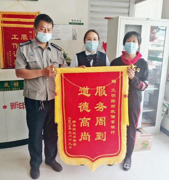 “邮政不愧是‘国家队’,员工素养高,责任心强,还有急救常识,在我哥突发疾病的时候,你们临危不乱,及时救助。我哥能遇到你们这些好心人,真是太幸运了!谢谢你们!”5月22日,暴女士为滑县文明路邮政支局送去了一面写着“服务周到,道德高尚”的锦旗,她还向支局员工深深地鞠了一躬,对该支局员工及时救助家人表达了深深的谢意。