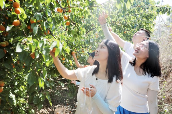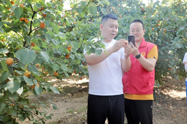 三门峡市分公司网红主播董康(左)与党员干部一起为蔡白村贵妃杏直播带货