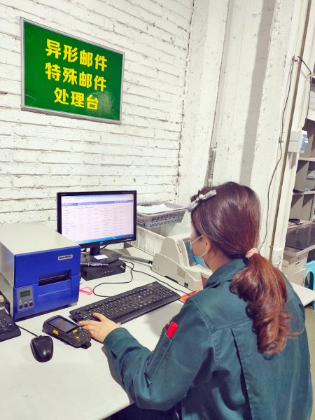 分拣封发员王玉萍正在处理特殊邮件信息