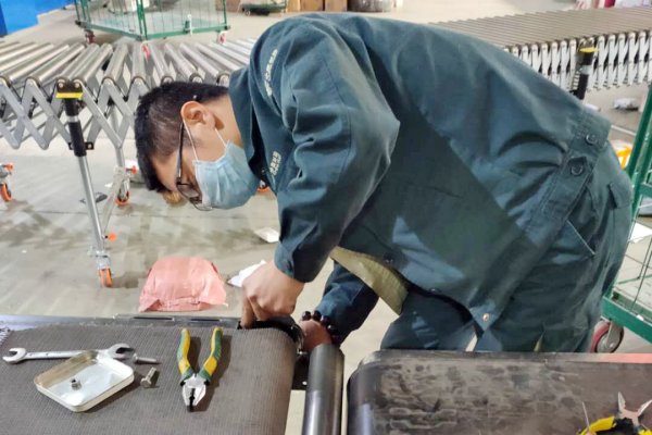 转运员马乐乐正在修补传送带
