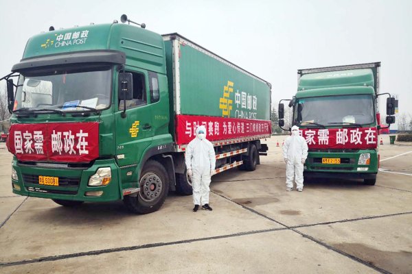 邮运司机汪新卢(右)和郑州邮区中心局的同事穿戴好防护服,向武汉运送物资