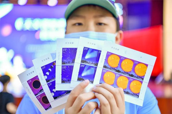 天文现象,简称天象,在古代是对天空发生的各种自然现象的泛称,而在现代通常指发生在地球大气层外的现象。例如月亮的盈亏、太阳的升落、行星的冲合、流星的闪逝、彗星的隐现、新星的爆发、日月的交食等。为更好地展现天文现象的特点和宇宙的神秘浪漫,在邮票设计上,工艺师采用了5枚邮票5种工艺的全新印制方式。