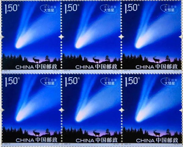 “大彗星”邮票运用了明暗相间、立体透视的暖素面材料,使彗星的彗核、彗发和彗尾融为一体,绚烂夺目,非常壮观。