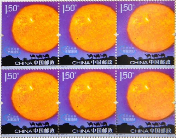 “水星凌日”邮票再现了水星掠过太阳的过程,背景创新性采用了立体景深透明材料,在紫外灯照射下,能清晰地看到整套邮票黑色剪影线条的荧光效果,形成了强烈的视觉效果吸引。