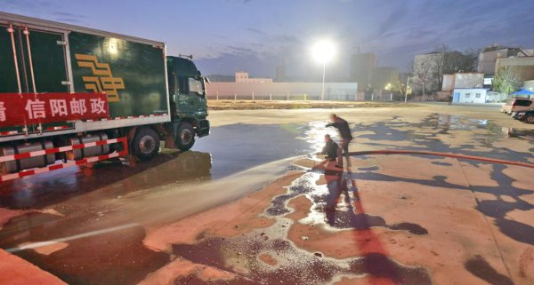 夜色降临,邮区中心局的党员们继续为作业场地、邮政车辆进行清洗、消毒