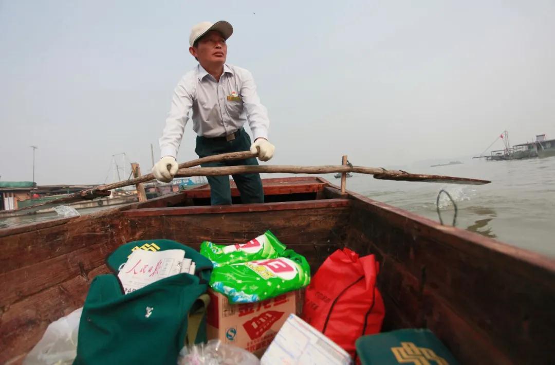 古铜色的皮肤让唐真亚和渔民别无二致。常年在水上投递,风里来雨里去,这种生活对唐真亚来说已经稀松平常。
