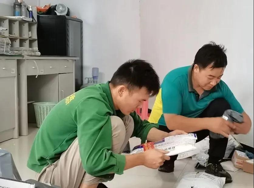 刘诗民(右)和团队同事一起分拣邮件