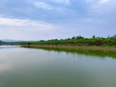 一带澄澈碧绿的河水缓缓流淌,岸边树木葱茏、绿草如茵。有画者在依河写生,有行者在闲适漫步,不远处嘹亮悠长的唢呐声随风飘扬。