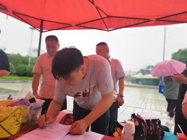 献血活动现场,临湘市邮政分公司党员积极配合医务人员,耐心排队,按照要求有序进行信息登记和表格填写,经过采血、测血型、量血压等指标检测全部合格后,7名党员大义伸臂,为“爱”撸袖,用自己的滚烫热血传递爱心与真情。