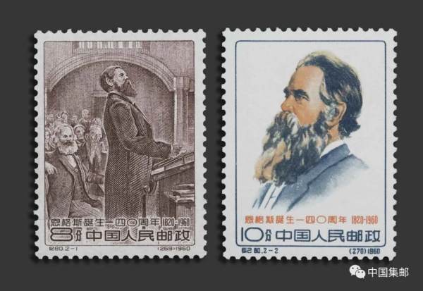 纪80《恩格斯诞生一四〇周年》邮票发行于1960年11月28日。邮票同样采用苏联著名版画家尼·尼·茹可夫的两幅作品。由中国第一位女邮票设计家卢天骄设计。第一枚《恩格斯在第一国际海牙代表大会上讲话》描绘的是1872年恩格斯在第一国际海牙代表大会上演讲的风采。他身材高大,神情庄严,有力的宣传了马克思主义理论。身后就坐的就是马克思,正在认真倾听。观众神态各异,使人有身临其境之感,也衬托出马克思主义理论震撼人心的力量。