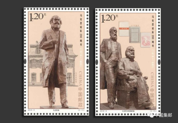 2018-9《马克思诞辰200周年》纪念邮票发行于2018年5月5日。邮票选取中国美术馆馆长、著名雕塑家吴为山的两件雕塑作品。第一图为马克思像,这尊雕像既运用了中国现代写意雕塑的创作手法,又融汇了欧洲写实主义传统,表现了行走中的马克思,以自信深邃的目光、从容坚定的步伐,从特里尔走向世界,从历史走向未来,艺术地再现了这位伟人的气度和风范。此像在马克思诞辰200周年之际,由中国赠送给马克思的故乡——德国西南部城市特里尔市。第二图为马克思与恩格斯像,恩格斯站在马克思身后,象征着两人伟大的友谊。背景为《共产党宣言》德文版、中文版以及《资本论》中文版等马克思著作。
