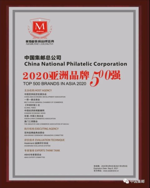 9月9日,“第15届亚洲品牌盛典”在海南自贸港开幕,“2020亚洲品牌500强”榜单同时发布。中国集邮总公司挺进亚洲品牌500强位列第197位,并荣膺“一带一路文化品牌金奖”。