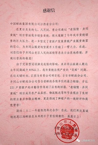 近日,井冈山市人民政府专门向省分公司发来感谢信,对江西邮政鼎力相助,极大缓解该市因受疫情影响导致的黄桃“卖难”问题,为井冈山脱贫攻坚提升工作助力表示由衷的感谢,并期待与邮政的再次合作。