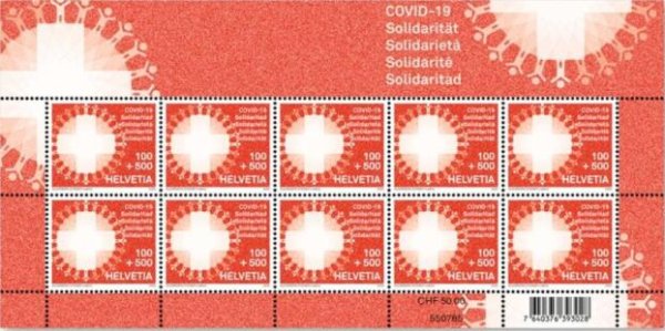 4月6日瑞士邮政发行世界首枚《COVID-19团结》附捐邮票,邮票面值1瑞郎外加5瑞郎的附捐额,小版张10枚售价50瑞郎(约合人民币365元),邮票构图以瑞士国旗十字图案为中心,人人都为抗击疫情贡献力量,发光发热,最终形成了一个闪亮的地球,表达了瑞士民众携手抗疫的决心,也象征着新冠病毒大流行期间瑞士人民的团结,捐款所得全数交瑞士团结基金会和瑞士红十字会用于应对此次疫情。正如瑞士邮政所说“帮助我们帮助别人!购买这些邮票,你就是在与瑞士邮政团结一致”。