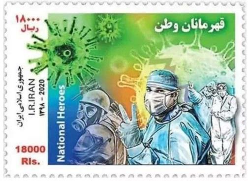 从世界范围来看,为应对此次新冠肺炎疫情,第一个发行抗疫主题邮票的国家是伊朗。3月17日,在疫情持续加重之际,伊朗邮政增发抗疫邮票以致敬奋斗在抗击新冠病毒一线的医护工作者和防疫人员。伊朗总统哈桑·鲁哈尼亲自出席了首发式,并在首日封上签名。邮票描绘了三位戴着口罩的医疗人员和一位戴着防毒面具的士兵,医疗人员比出的剪刀手表明了对战胜疫情的必胜信念,背景处展现的是新冠病毒毒株形象,票面左下方还印有“民族英雄”(National Heroes)字样。