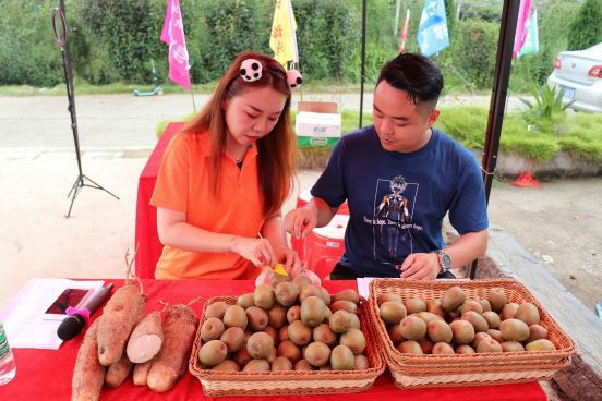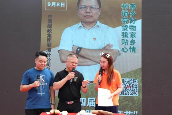 湘潭市科学技术局局长潘永其、湘潭邮政分公司总经理雷雨变身网络主播现场进行直播带货,推介茶恩猕猴桃、白薯等农特产品。