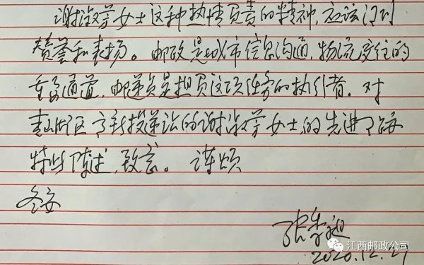 “邮政是城市信息沟通、物流交往的重要通道,投递员是担负这项任务的执行者。谢淑芳女士这种热情负责的精神,应该得到赞誉和表扬……”1月5日,南昌市分公司收到了江西科技师范大学离休教授张季昶寄来的一封表扬信。信中,张教授讲述了表达感谢的原委。原来,前段时间他通过书信寻找自己的一位老战友。但是由于时间久远,地址不清、电话不明,高新投递站投递员谢淑芳两次耐心电话询问有关情况后,终于找到了老战友的现地址,让其知道了下落。纸短情长,见字如面。张教授字里行间充满着对投递员谢淑芳认真工作的肯定,对邮政以永不懈怠的姿态践行着“人民邮政为人民”的初心和使命表示了高度的赞扬。