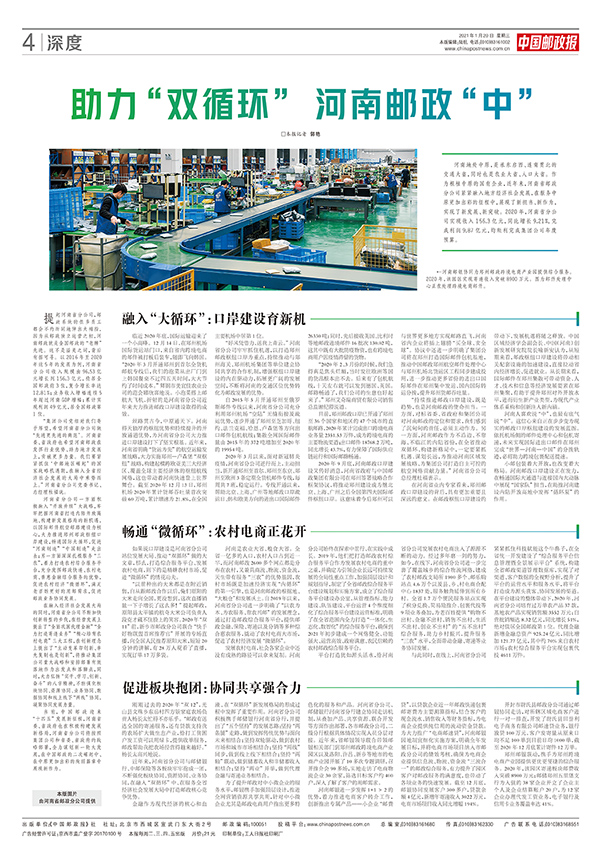 河南地处中原,是承东启西、连南贯北的交通大省,同时也是农业大省、人口大省。作为根植中原的国有企业,近年来,河南省邮政分公司紧紧融入地方经济社会发展,在服务中原更加出彩的征程中,展现了新担当、新作为,实现了新发展、新突破。2020年,河南省分公司实现收入156.4亿元,同比增长9.27%,完成利润9.87亿元,均顺利完成集团公司年度预算。1月20日,中国邮政报以《助力“双循环” 河南邮政“中”》为题,对河南邮政进行了专版深度报道。