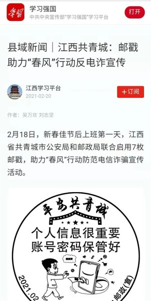 日前,《学习强国》平台刊发《江西共青城:邮戳助力“春风”行动反电诈宣传》新闻,聚焦共青城市公安局和邮政分公司联合启用7枚邮戳,助力“春风”行动防范电信诈骗宣传活动。