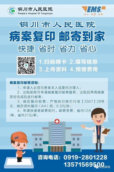 “以后铜川市民取病历病案再也不需要亲自跑腿了!”为了让患者们更加省心、省力,足不出户就能领到病案复印件,5月6日,铜川市分公司与铜川市人民医院合作推出“病案复印、快递到家”服务。患者只需点击关注“铜川市人民医院”微信公众号,用手机在线申请,即可在家坐等邮政快递送病案复印件上门。