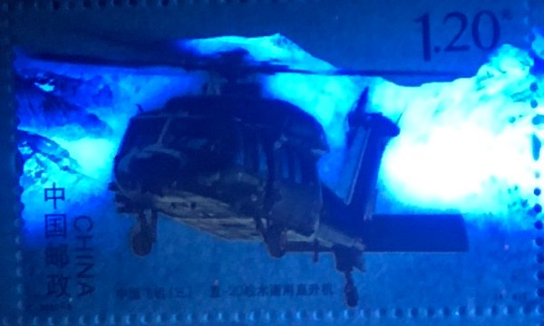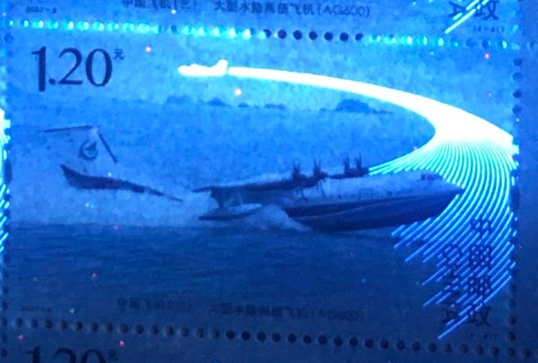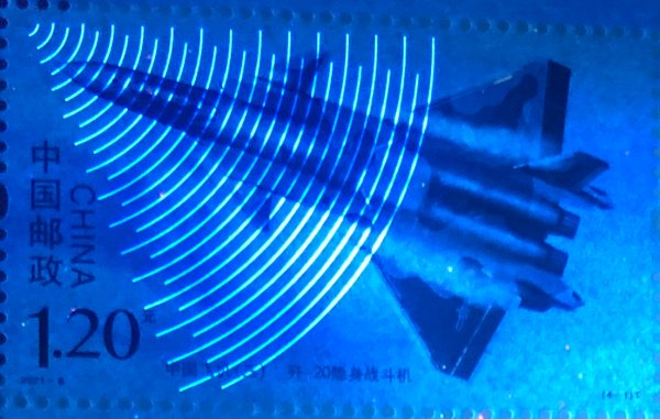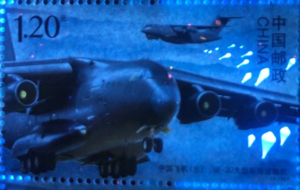 邮票采用特亮银、珠光专蓝、黑、专红、专黄、无色蓝荧光六色印刷,专色与特种墨叠印套色,具有一定的防伪性。特别是特亮银采用层次印刷,既突出了飞机的金属质感和大国重器,又巧妙地将飞机的高光和厚重感同时展现出来。另外,专蓝衬入珠光,珠光和冷色调的搭配使用在机身和背景中,提升机身质感的同时,背景也具有柔和的光泽质感。在紫外灯下,邮票可呈现画面之外不同的场景和元素,烘托和表现邮票主体不同机型的特征,讲述邮票故事,增强趣味性和防伪性。一图可看到明显的雷达散射截面,表现出歼-20有效反射雷达电波作为中国空中力量代表作的高隐身特征。二图可看到近景飞机和降落伞纷沓而至,表现出运20运输机可以执行各种物资和人员的长距离航空运输任务的空中巨无霸特征。三图用无色荧光突出背景雪山,表现出直-20直升机可在极寒高原地区运输和抢险的特征。四图可看到由水面飞行到空中的轨迹和姿态,表现出“鲲龙”AG600水陆两栖的特征。