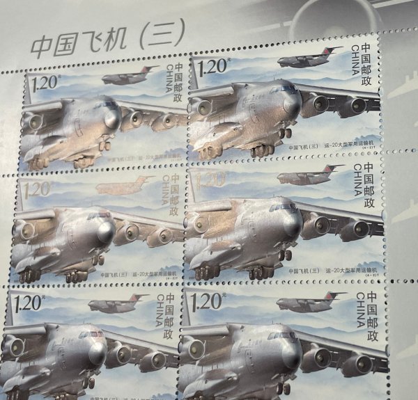 邮票采用高分辨率制版技术,10μ调频网印刷,无论是裸眼还是放大镜下,飞机细节特征清晰可辨,画面层次细腻丰富,暗调和高光层次表现准确。