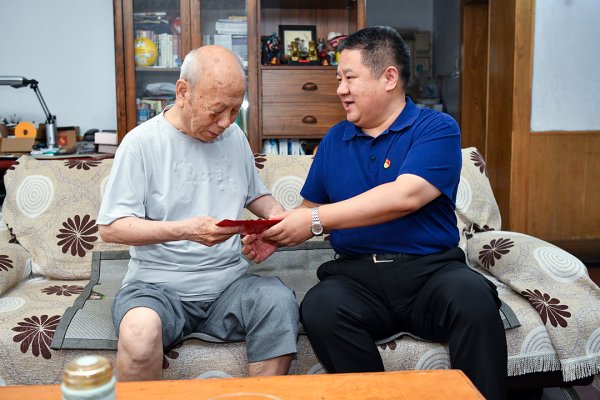 在看望慰问现年92岁、党龄72年的抗战老兵颜光同志时,杜福与他亲切交谈,了解了颜光同志13岁参加革命,矢志不渝跟党走的战斗岁月,一起回顾了我党百年的光辉历程。