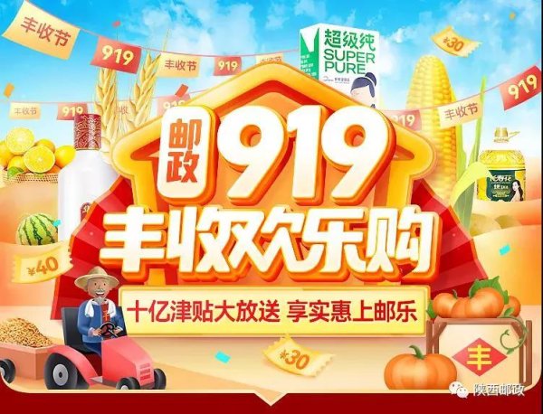 为服务国家乡村振兴战略,落实集团公司惠农合作要求,结合“农民丰收节”,陕西邮政于8月24日在省内启动“919电商节”。全省邮政以“购物上邮乐,全家都欢乐”为主题,邀请农业农村部门共同参与,突出“线上+线下”相结合、突出“网点+站点”生态圈打造、突出创新,运用新理念、开创新局面、构建新业态、打造新体验,展现邮政农村电商全新的社会形象,为服务乡村振兴注入新动力。
