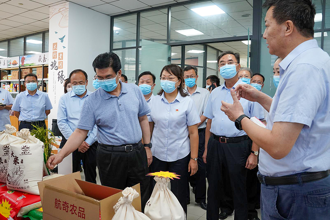 随后,何金平一行来到了产品展示厅,太行魂、黄河缘、牧野味、新邮情四个主题的农特产品琳琅满目,何金平不时驻足询问产品的价格、品质、销售渠道和销往地。得知纳入全国邮政基地产品原阳大米,通过邮政直播打开了河南特产销往长三角、珠三角的新渠道,目前每场直播可实现订单2000余单时,何金平对邮政“北货南销”的思路和做法给予充分肯定。他指出,纬度不同和气候差异,形成了特色各异的源产地农产品,邮政部门要突出农产品源产地特点,打造地方特色品牌,实现各地优势产品互补。