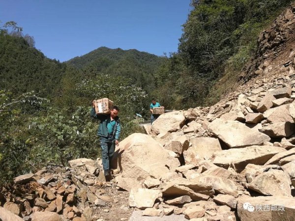 然而,当邮车走到中途快到大市川村时,这里因为降雨也出现了塌方,前行道路再次被山石阻断,部分路段仅能勉强步行通过。得知这一消息后,碾子支局负责人黄涛立刻与县分公司及邮车驾驶员取得联系,带领2名员工赶往大市川村接收邮件。在烈日炎炎下,大家扛着邮件,一件件背、一步步走,越过乱石陡坡,汗水浸湿了衣服。路旁的群众看到后,纷纷向邮政员工竖起了大拇指。