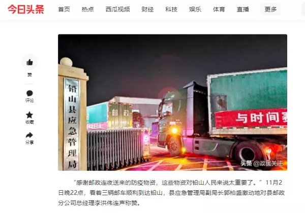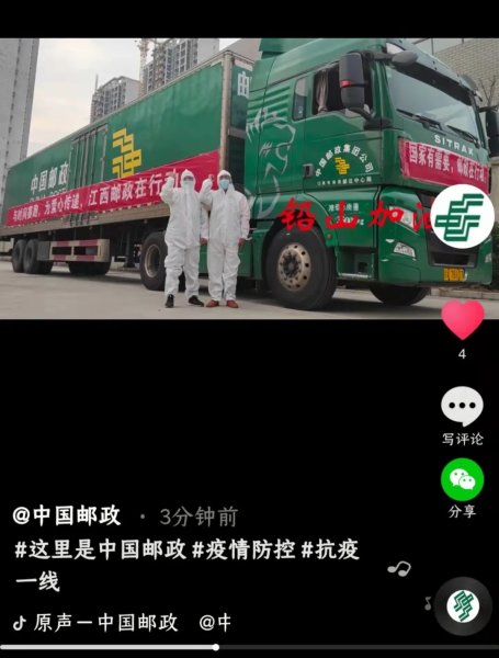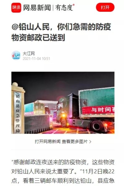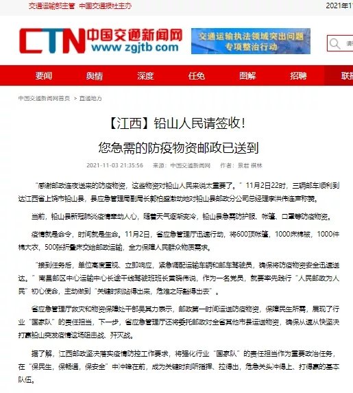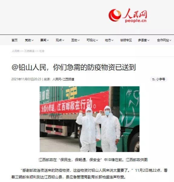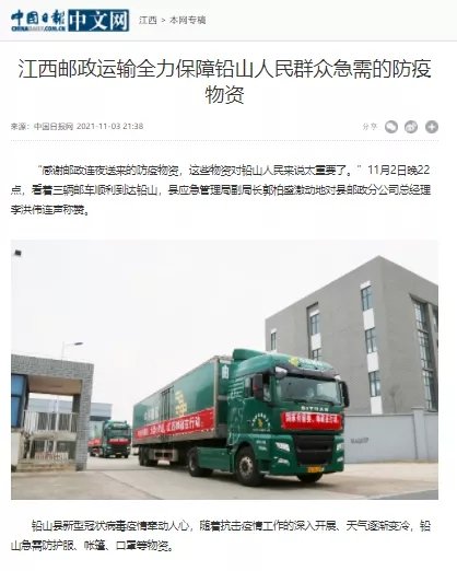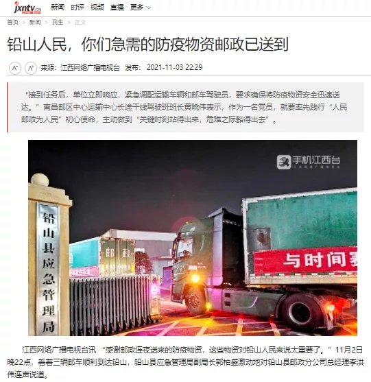 《江西邮政运输全力保障铅山人民群众急需的防疫物资 》《铅山人民请签收!您急需的防疫物资邮政已送到》《#这里是中国邮政#疫情防控#抗疫一线#》……连日来,人民网、中国日报网、中国交通新闻网、中国邮政抖音号、今日头条、网易、搜狐、江西电视台、江西手机台、大江网、省邮政管理局抖音号、南昌广播电视台等媒体持续刊发我省邮政驰援铅山,连夜运送防疫物质的新闻报道。