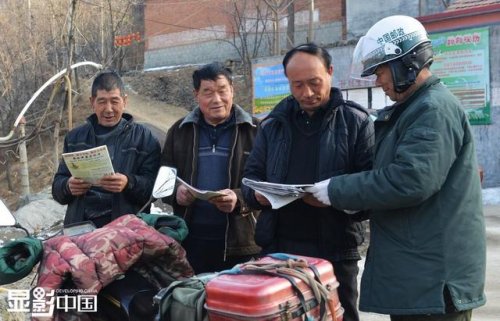 董乃军负责200多个投递点,他每天需要带着近百十斤重的邮包,翻越十几座山头为村民投递,38年的时间已经丈量了一百多万公里的山路,骑坏了十几辆自行车,但从没有因为天气原因或自己的疏忽懈怠而耽误任何邮件的投递,实现了38年无差错。图为董乃军从村里离开时,老人们和他挥手告别。