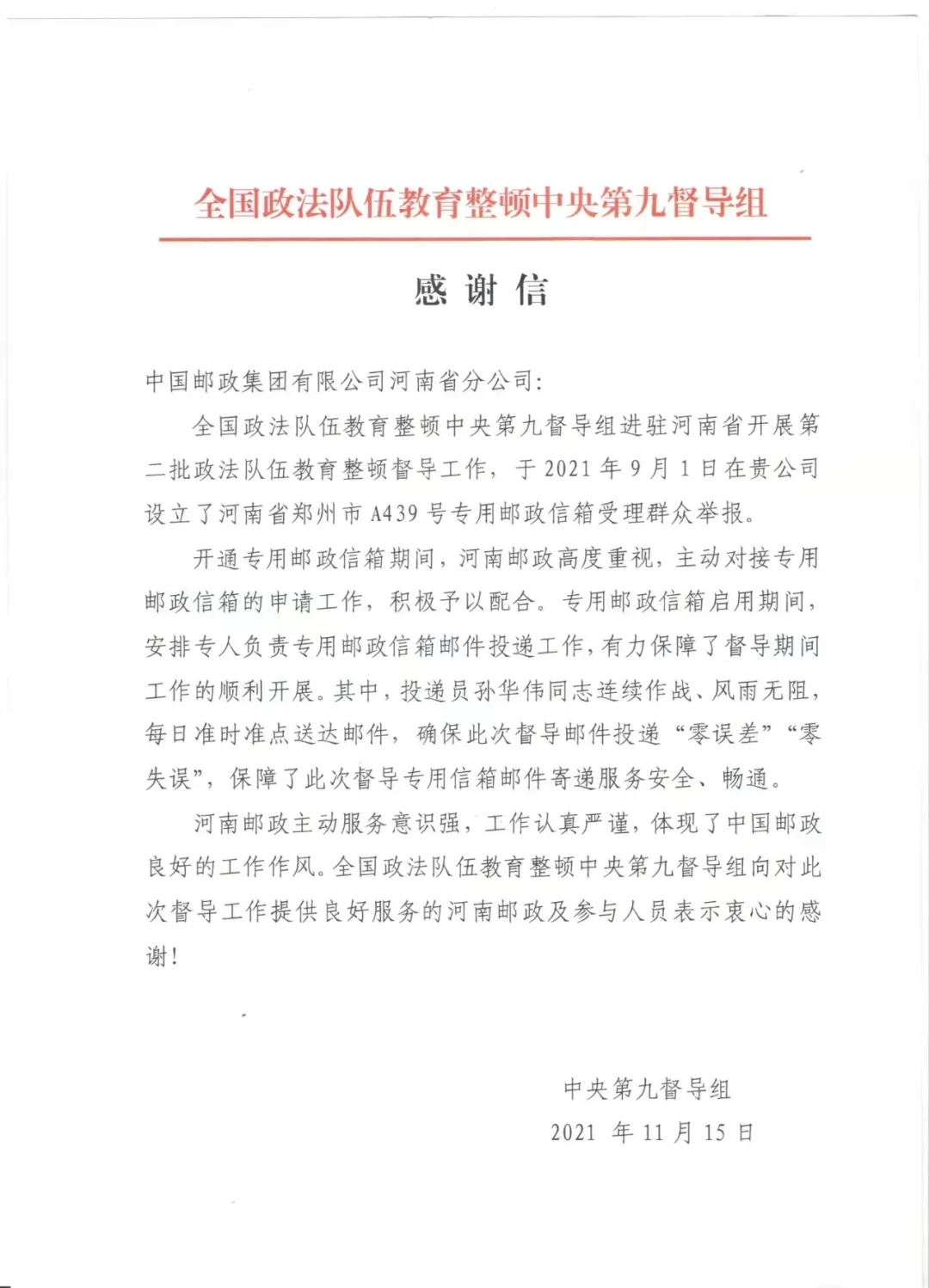 11月15日,全国政法队伍教育整顿中央第九督导组向中国邮政集团有限公司河南省分公司发来感谢信,对河南邮政确保督导邮件投递“零误差”“零失误”、保障专用信箱邮件寄递服务安全和畅通表示衷心感谢。