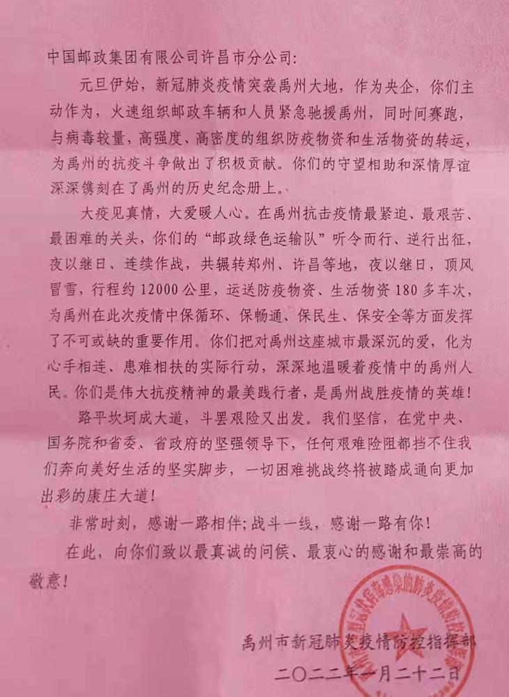 近日,禹州市新冠肺炎疫情防控指挥部发来感谢信,对许昌“邮政绿色运输队”听令而行、逆行出征、驰援禹州,助力疫情防控”给予了充分肯定和高度评价。许昌“邮政绿色运输队”的10名队员还被市邮政管理局授予全市邮政行业“抗击禹州新冠肺炎疫情突出贡献先进个人”荣誉称号。