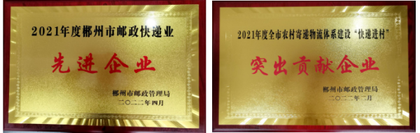 郴州市邮政分公司在2021年度郴州市邮政快递业先进企业和全市农村寄递物流体系建设“快递进村”突出贡献企业评选活动中,喜获“先进企业”和“突出贡献企业”荣誉称号!