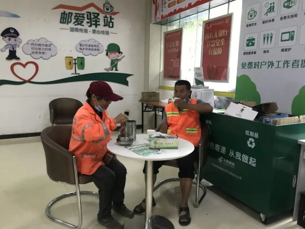 “邮爱驿站”是邮政志愿服务品牌,它是依托邮政支局、所等营业服务网点建设的休息场所,免费为社会公共服务的户外工作者提供力所能及的服务。重点服务对象为环卫工人、交通警察、城管、出租车司机以及志愿者等。泰和县分公司最先在城西邮政所建起了第一个“邮爱驿站”,配备了桌椅、饮水机、微波炉、报刊架、应急药品、电冰箱、充电宝等设备和物品,提供包括休息、就餐、Wi-Fi、手机充电、饮水、雨伞、应急外敷药品等服务,并安排有专人负责日常管理和维护工作,把“邮爱驿站”打造成户外劳动者们的“歇脚地”“暖心屋”。