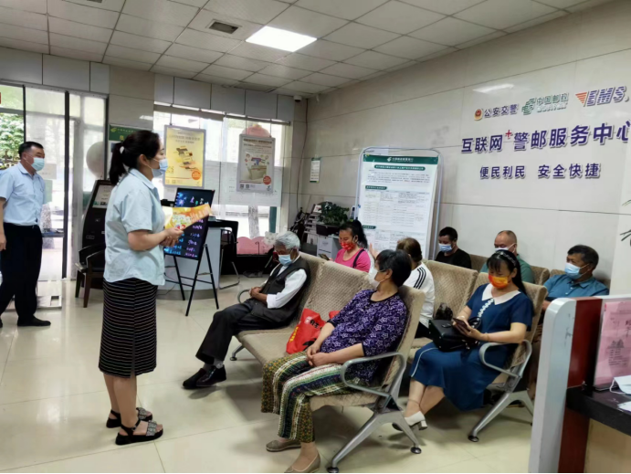 活动现场,5名身穿志愿服装的邮政志愿者分工协作,端茶倒水,细心指引,热情地接待前来参加活动的居民,对他们提出的问题耐心解答,同时向在场居民发放了反电诈和居民安全知识宣传册。