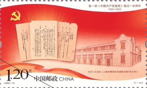 7月23日,《第一部<中国共产党章程>通过一百周年》纪念邮票将发行。该套邮票一套1枚,全套面值为1.20元,计划发行680万套。