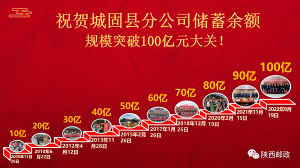 “城固是全省县分公司金融业务发展的标杆,继去年11月15日余额规模成功突破90亿元之后,时隔10个月,于今年9月19日,再次刷新全省县区分公司储蓄业务发展新高度,余额规模顺利突破100亿元大关。这不仅是城固邮政金融业务发展的大事件,也是全省邮政金融业务发展的大事件!”9月22日下午,在庆祝城固邮政储蓄余额规模突破100亿元表彰大会上,省分公司党委书记、总经理高军在讲话中对城固邮政的发展成绩给予高度肯定。